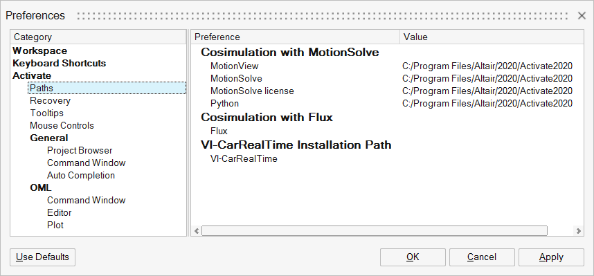 ローカルおよびリモートの連成シミュレーション方法に必要なMotionSolveおよびその他のソフトウェアへのパスを定義します。
