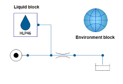Environmentブロックは、周囲の圧力や重力定数の値のような、環境条件に関する情報を収めています。Liquidブロックは、モデルで使用する作動液を規定します。モデルを構成するすべての水力コンポーネントを、このブロックに接続する必要がある理由は、この点にあります。各コンポーネントにLiquidブロックを手動で容易に接続できるように、一定の範囲のコンポーネントにはforwardFluidPropertiesオプションが用意されています。このオプションを使用すると、流体情報がコンポーネント間で転送されるので、Liquidブロックを各流体回路に一度だけ接続すればすみます。