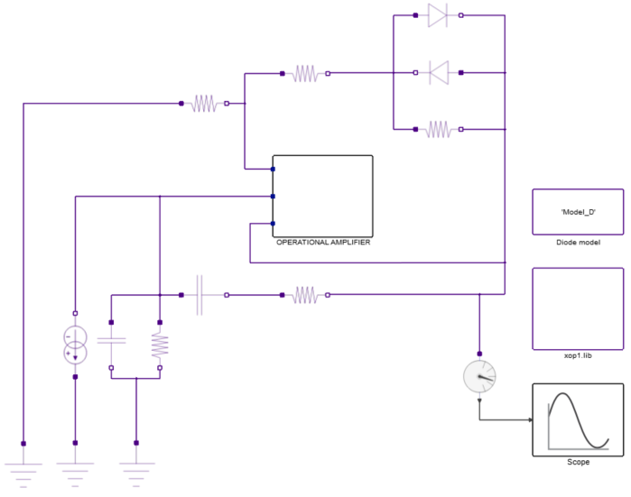 ActivateブロックとHyperSpiceブロックを結合すると、必要に応じて適切なインターフェースブロックが自動的に挿入されます。次の例は、インターフェースブロックを介してScopeブロックに接続した電子システムのモデルです。