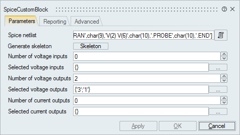 SpiceCustomBlockでは、SPICEネットリストを利用して、モデルに新しい電子部品を作成したり、モデルにある既存の電子部品を変更したりできます。このブロックは、そのポート、パラメータ、シミュレーション関数を含め、自由にカスタマイズできます。