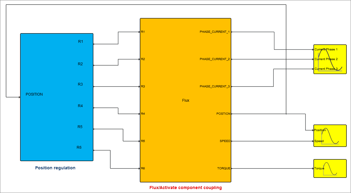 連成シミュレーション時に、ActivateモデルからSPMモーターのFluxモデルに三相ブリッジ電流が供給されます。シミュレーション結果には、SPMモーターの性能が示されます(位置、速度、トルクなど)。