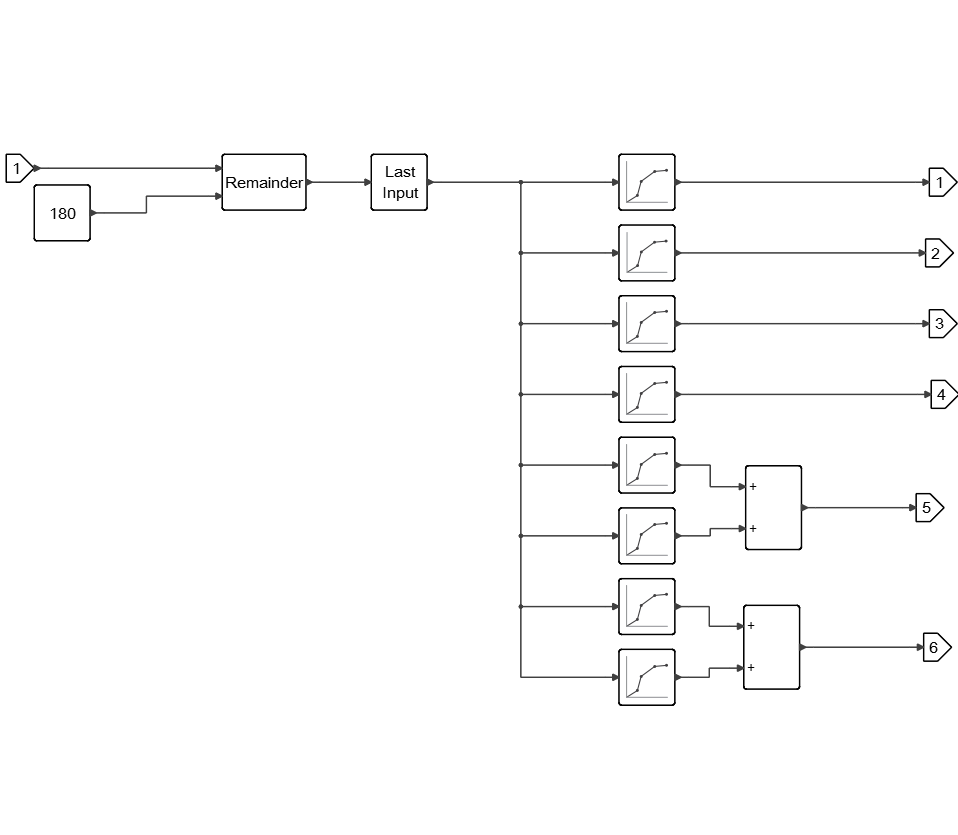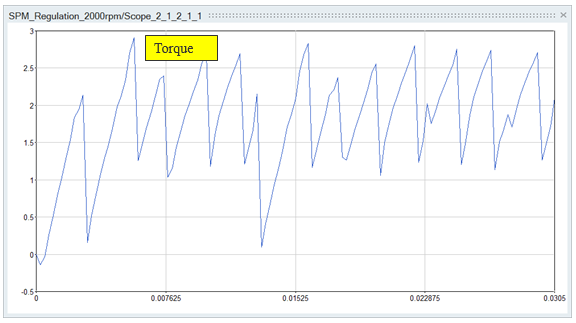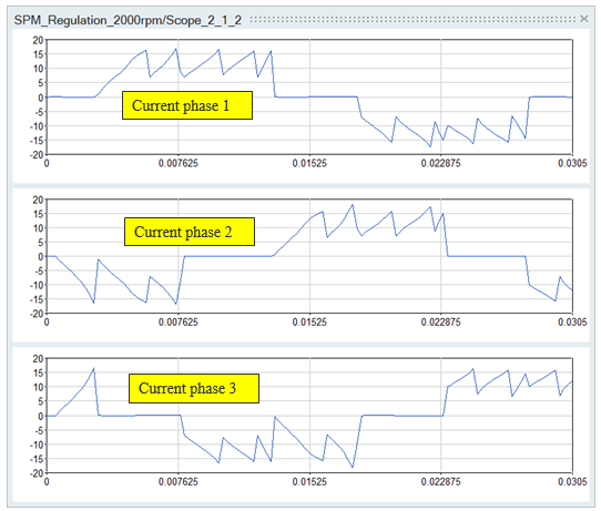 このSPMモーターは三相ブリッジ電流で駆動されます(フリーホイーリングダイオードは省略しています)。インバーターの駆動回路によるモーターの1000 rpm定速回転をシミュレートして、モーターのトルク、速度、位置、相電流を得ます。インバーターの切り替え方式は、ローターの位置によって決まります。