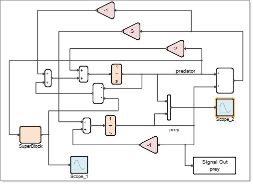 スコープブロックは、レビューするモデル内の各信号に接続します。次に示す前出の“肉食動物-獲物”モデルの例では、ダイアグラムの右側のScope_2が、時間の経過による棲息数の進展ををプロットするように定義されています。