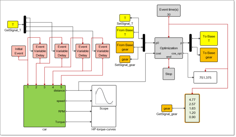Displayブロックは、ベクトルや行列も表示できます。以下は拡張定義からの例で、最適化後に取得された最適なギアボックス比が緑色のブロック内に表示されています。