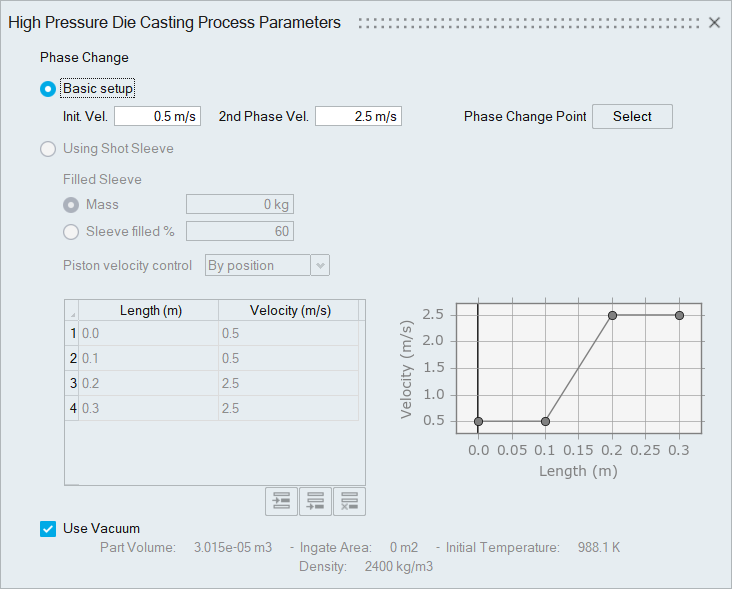 By position allows you to select the first and second velocity when the liquid reaches a selected position on the shot sleeve. The final position will be automatically edited depending on the designed shot sleeve length.