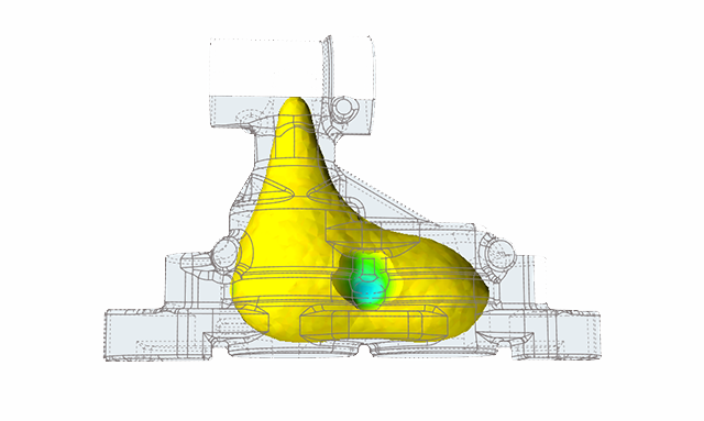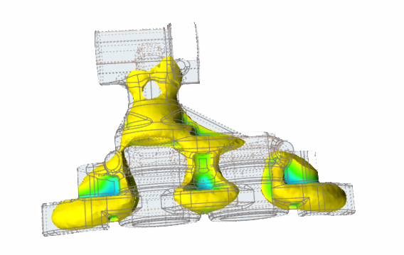 In the animation, solidified material (above 0.7) is transparent, while liquid material (below 0.7) is shown colored. Shrinkage porosity is more likely to occur in isolated areas.