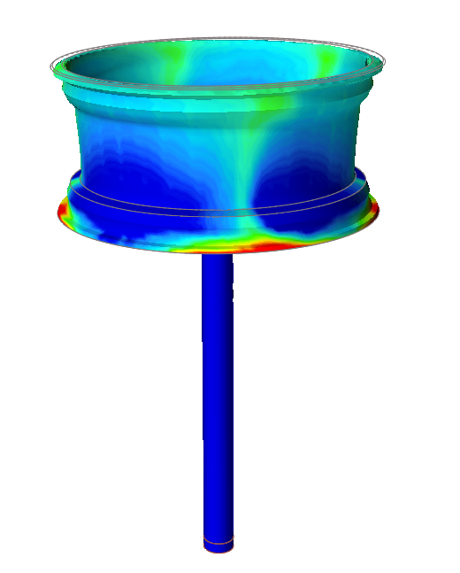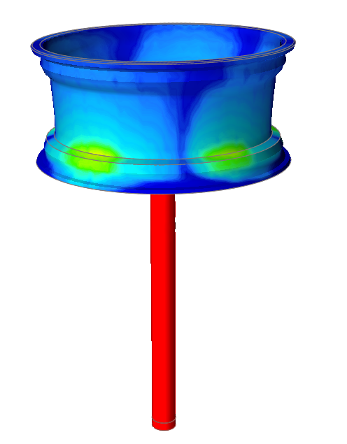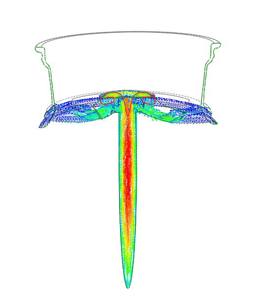 We can observe turbulence at the union between the wheel and the stalk due to the high velocity (around 7 m/s). Based on this result, coupled with the knowledge that there are no problems of early solidification during filling, we could decide to decrease the pressure to fill the wheel more slowly and avoid this turbulence.