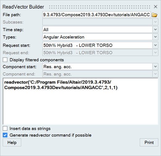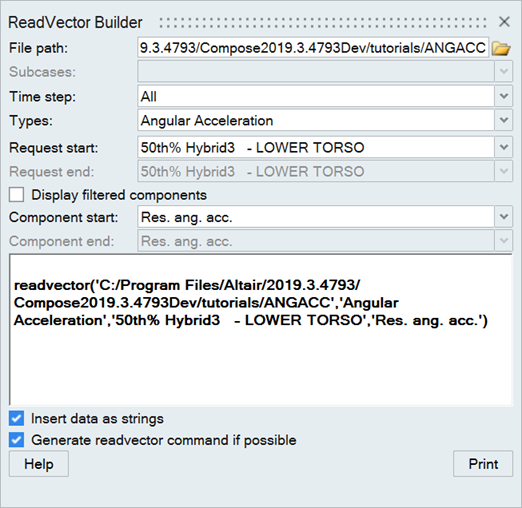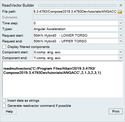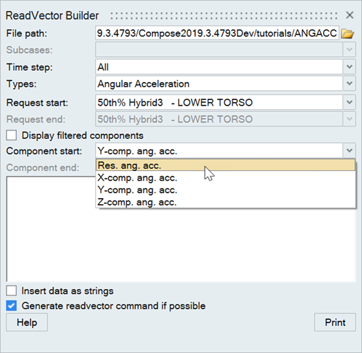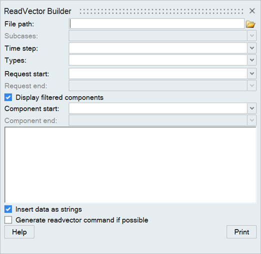readvectorbuilder is a utility tool that reads CAE results/data files supported byCompose. It helps you create the right readvector()and readmultvectors() commands. The tool opens the readvector utility dialog that can be used to select results files and navigate into the subcases, time steps, types, requests, and components contained in the selected file. Upon making your selections and selecting Print, the appropriate OML command (using either the readvector or readmultvectors command) is displayed.