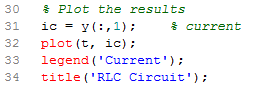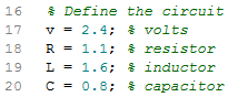 系の状態変数は、I、VR、およびVLです。これらの変数の時系列値を求めます。1番目の式は全面的に代数式であり、導関数を持ちません。これは、この系がODE系と明確に異なる点です。