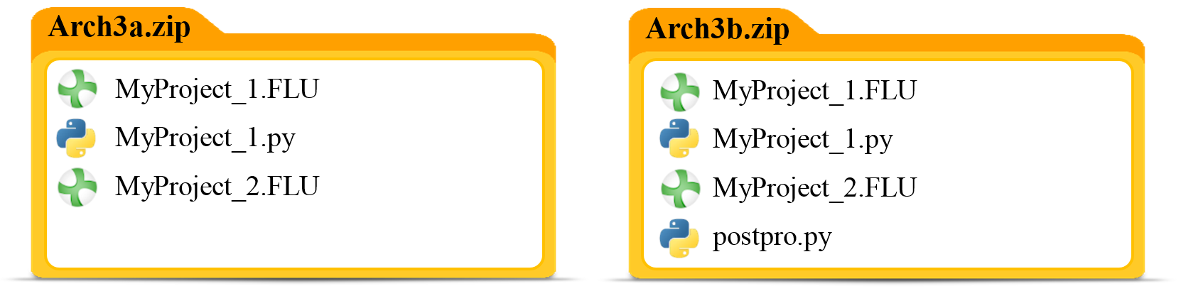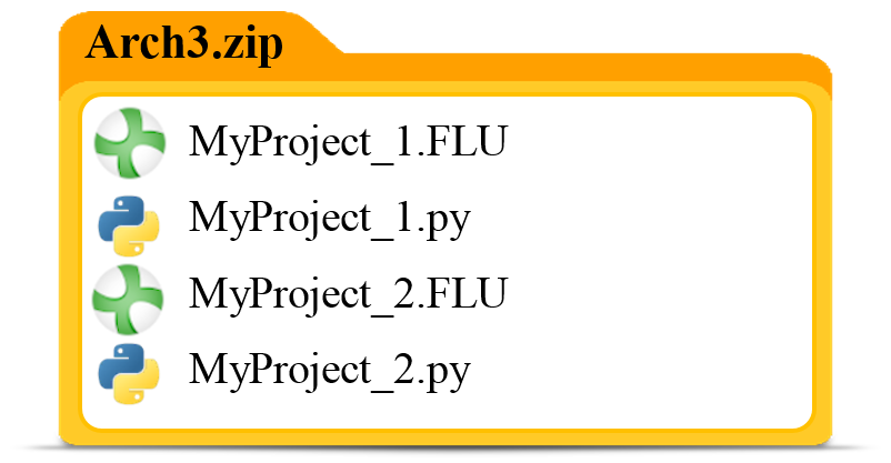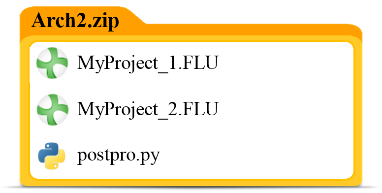 Arch3a.zip will create two jobs: one executing MyProject_1.py and the other solving MyProject_2.FLU, whereas Arch3b.zip loads MyProject_2.FLU and executes postpro.py.