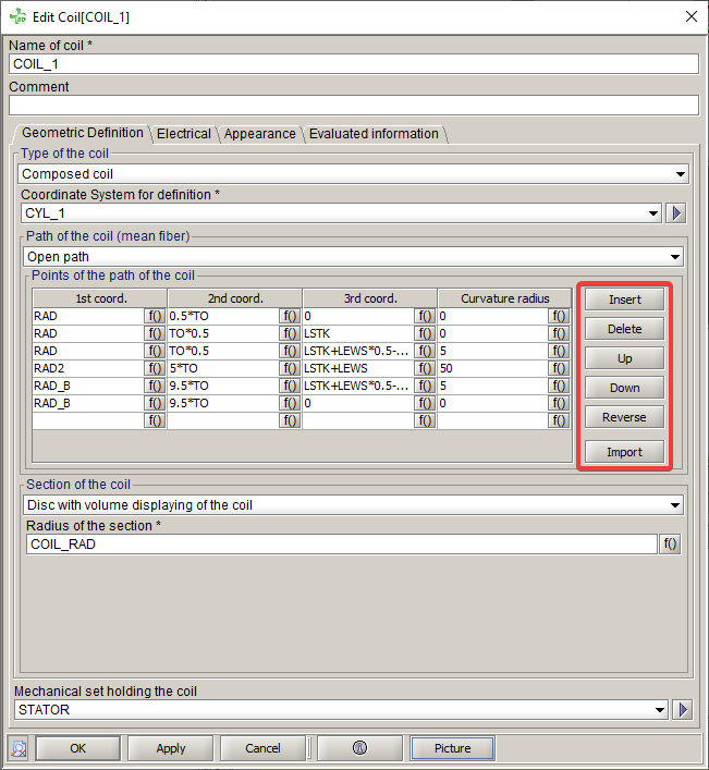 In Flux 2021, some features have been implemented in the creation dialog box of a non meshed coil of the "Composed" type to facilitate the creation / manipulation of the list of points of the path of the coil: