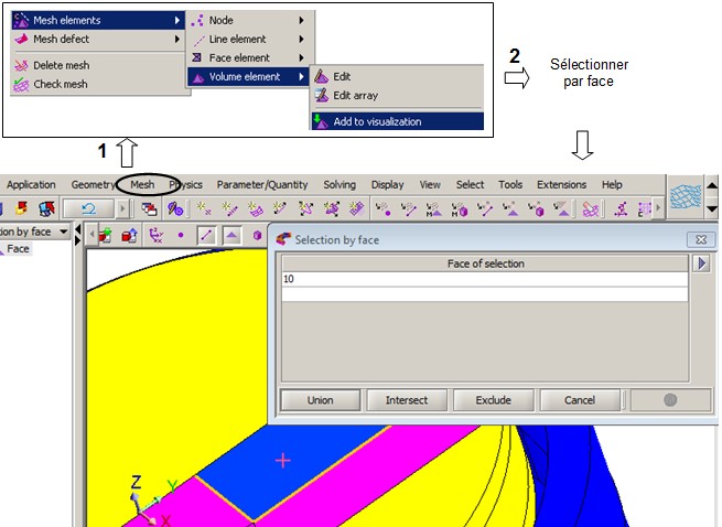 Dans cet exemple, on souhaite afficher les éléments pyramidaux sur la face 10 (maillée à l'aide du mailleur réglé en contact avec l'air maillé à l'aide du mailleur automatique.