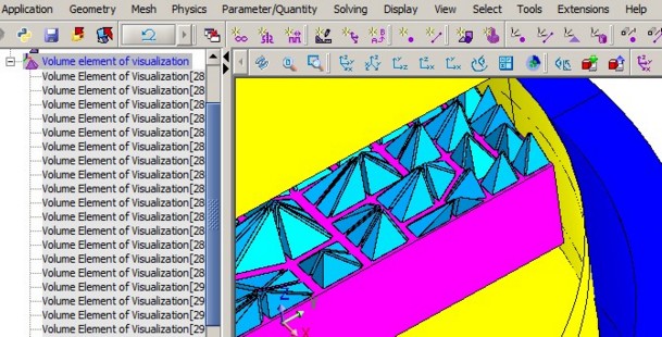 Les éléments pyramidaux situés sur la face 10 et en contact avec l'air maillé apparaissent dans l'arbre des données et dans la zone graphique.