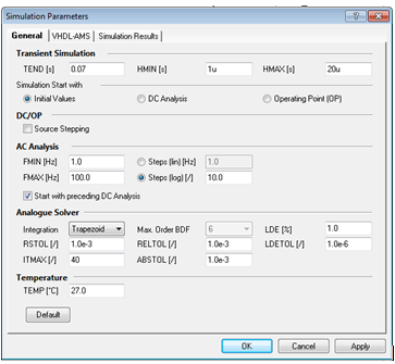 Configurer les paramètres de la simulation avec un intervalle de temps de 0 to 70ms et un pas de temps Portunus compris entre 1µs et 20µs, puis lancer la simulation.