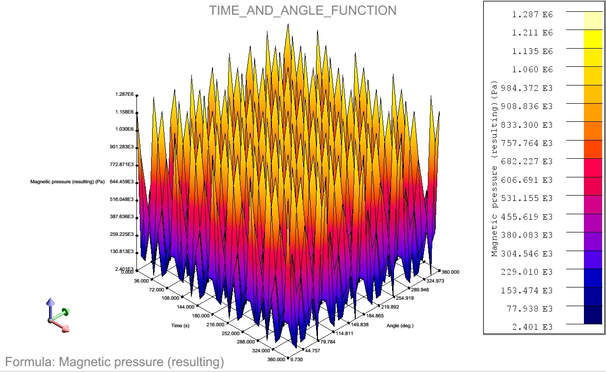 - Pression magnétique, permet de calculer le module de la pression magnétique et, éventuellement, de se limiter aux composantes normales (ou radiales) ou aux composantes tangentielles de la pression. La pression magnétique aux points de calcul est obtenue par la formule : où les premier et second termes représentent, respectivement, la composante normale et tangentielle de la pression magnétique.