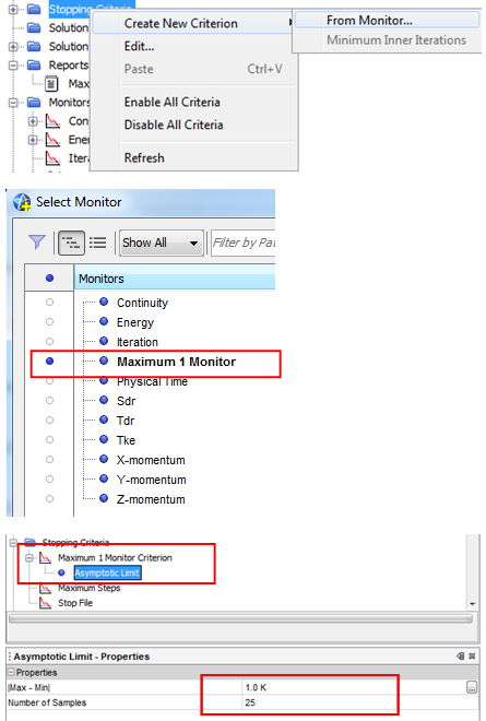 3) créer le critère d'arrêt à partir du « monitor » précédent et choix d'un critère « asymptotic limit » défini par une variation inférieure à 1K pendant 10 itérations.
