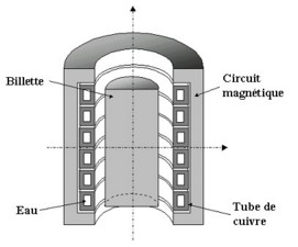 • un inducteur qui produit le champ excitateur : l'inducteur est une bobine constituée de 6 tubes de cuivre, alimentée par une source de tension sinusoïdale