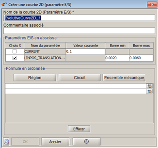 En cliquant sur Ensemble mécanique, la boite Editeur de formule et paramètre E/S (déjà existante) s'ouvre directement, sans passer par une nouvelle boite de dialogue intermédiaire comme c'est le cas pour Région et Circuit . Celle-ci contient les grandeurs globales associées à l'ensemble mécanique (position, vitesse, force…)