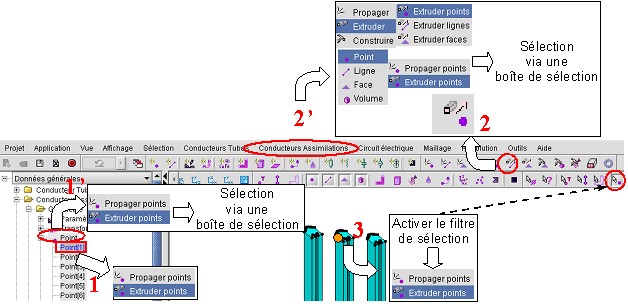 Pour activer la commande Extruder points, qui nécessite la sélection de données, choisir l'une des méthodes sur la figure suivante :