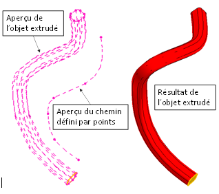 L'opération géométrique Extrusion suivant un chemin défini par des points permet d'extruder une ou plusieurs faces (appartenant à une esquisse ou appartenant à un objet) d'une même esquisse selon un chemin défini par des points donc les coordonnées sont renseignées par l'utilisateur.