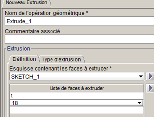 • L'opération EXTRUDE_1 a été ajoutée dans la liste des opérations géométriques liées à l'objet OBJ_EXTRUDE_1 (ainsi que SWEEP_ASSEMBLY si les faces extrudées n'appartiennent pas à une esquisse)