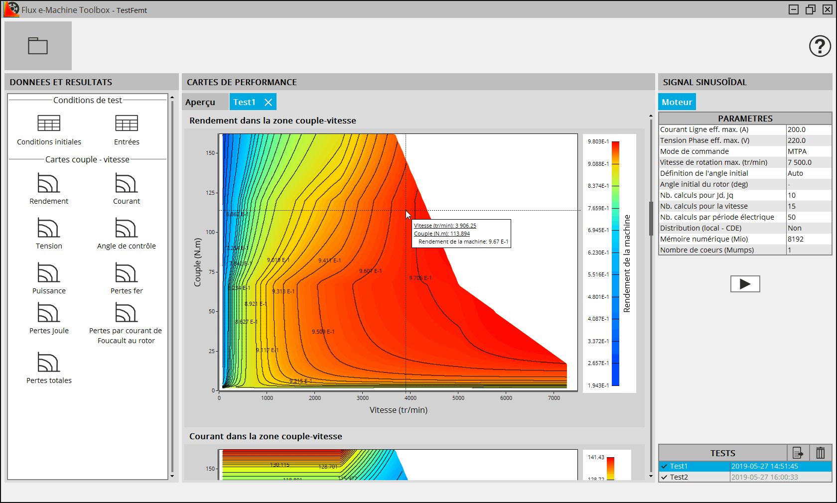 Plusieurs grandeurs sont exploitables dans la zone Couple Vitesse :