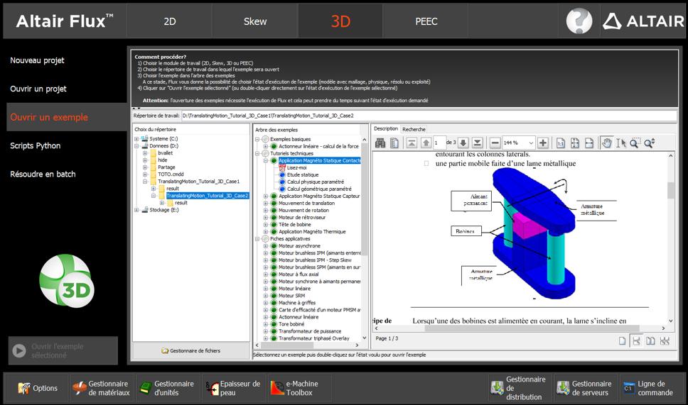 Ce contexte permet d'ouvrir un des exemples proposés dans l'état demandé (modèle avec maillage, avec physique, résolu, exploité).