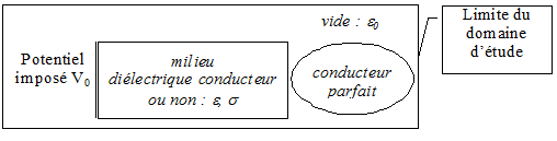 - donner des conditions aux limites sur les bords c'est-à-dire définir les valeurs de la variable d'état ( le potentiel électrique) sur les frontières du domaine