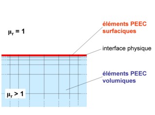Ces subdivisions sont d'épaisseur nulle car elles représentent des courants surfaciques et elles sont uniquement présentes sur les faces extérieures des matériaux magnétiques. La figure ci-dessous illustre ce principe.