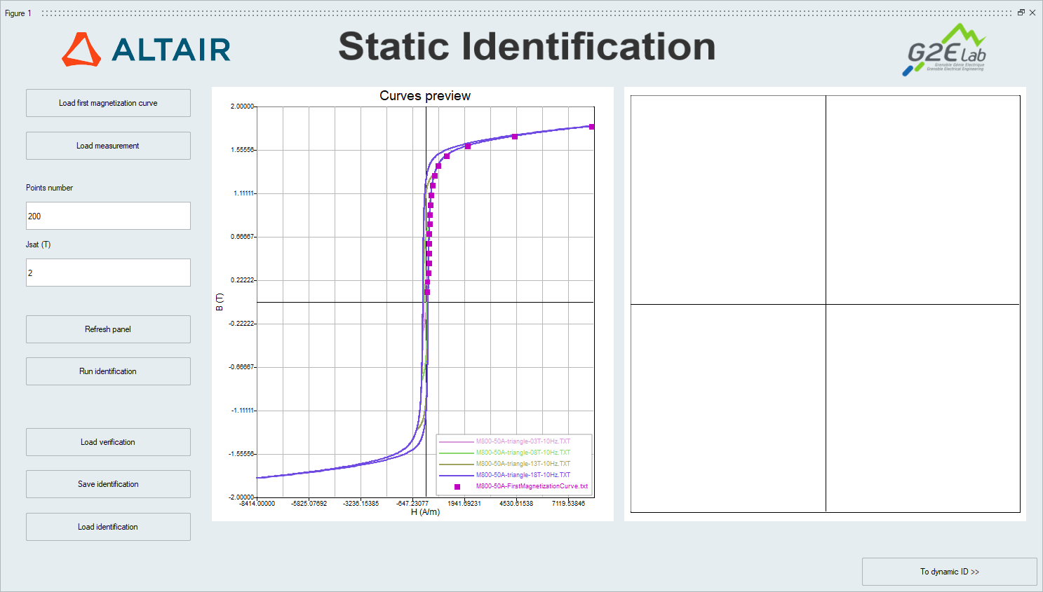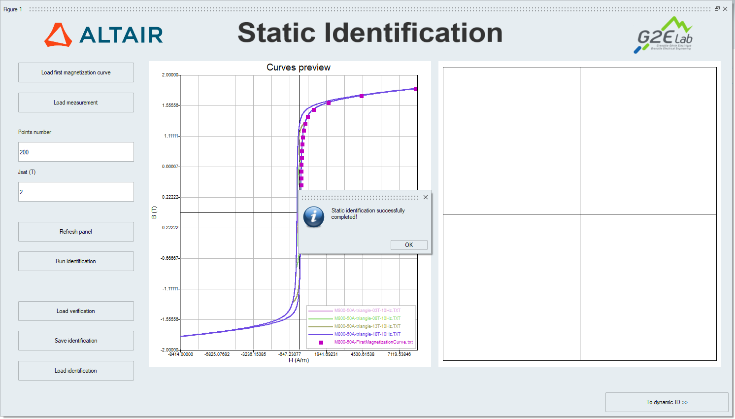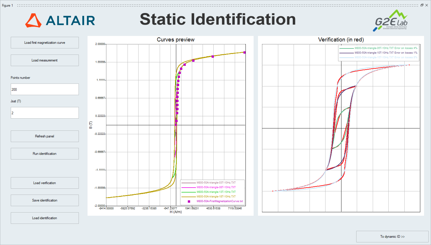 demande de charger plusieurs fichiers contenant des mesures.Note: Le modèle reconstruit un signal H' en imposant un B issu du fichier chargé, on pourra par la suite observer les deux cycles (original et reconstruit) tracés dans le graphique Verification comme montré dans la Figure 5.Note: Les cycles d'hystérésis reconstruits sont tracés en rouge dans le graphique Verification.Note: L'erreur relative entre les aires des cycles est affichée dans la légende du graphique Verification comme montré dans la Figure 5.