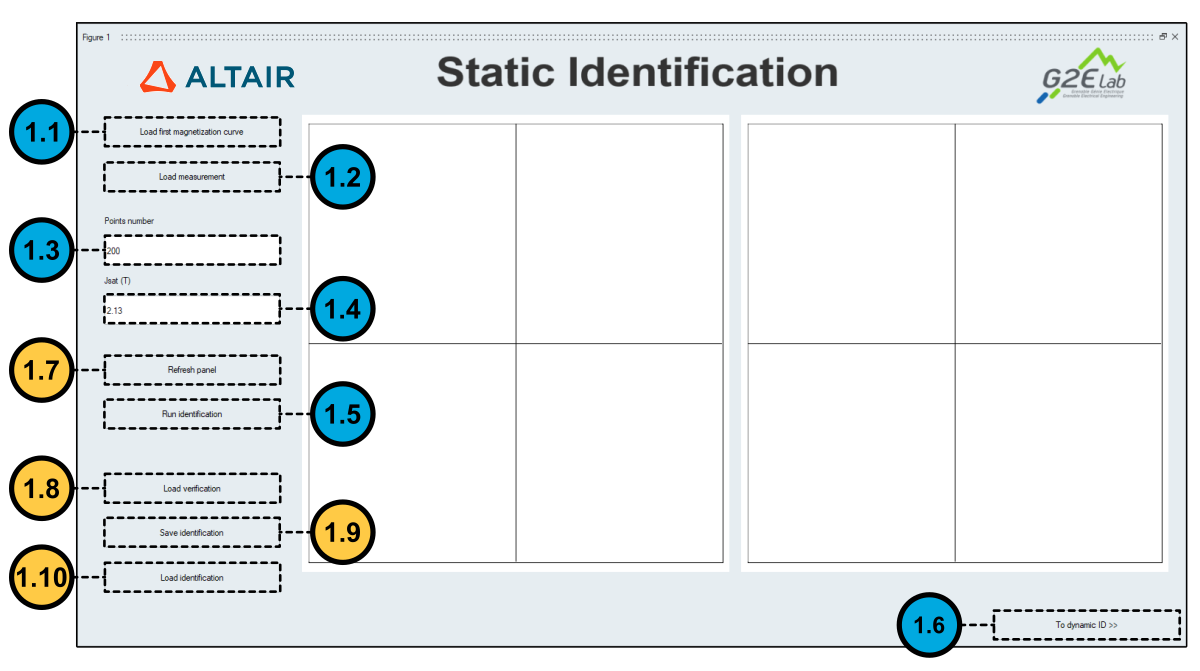 - Étape 1.1: Cliquer sur le bouton Load first magnetization curve, étiqueté 1.1 sur la Figure 1. Sélectionner le fichier de mesure dont le format est donné ici (un seul fichier doit être sélectionné) : Format des fichiers d'entrée et de sortie.