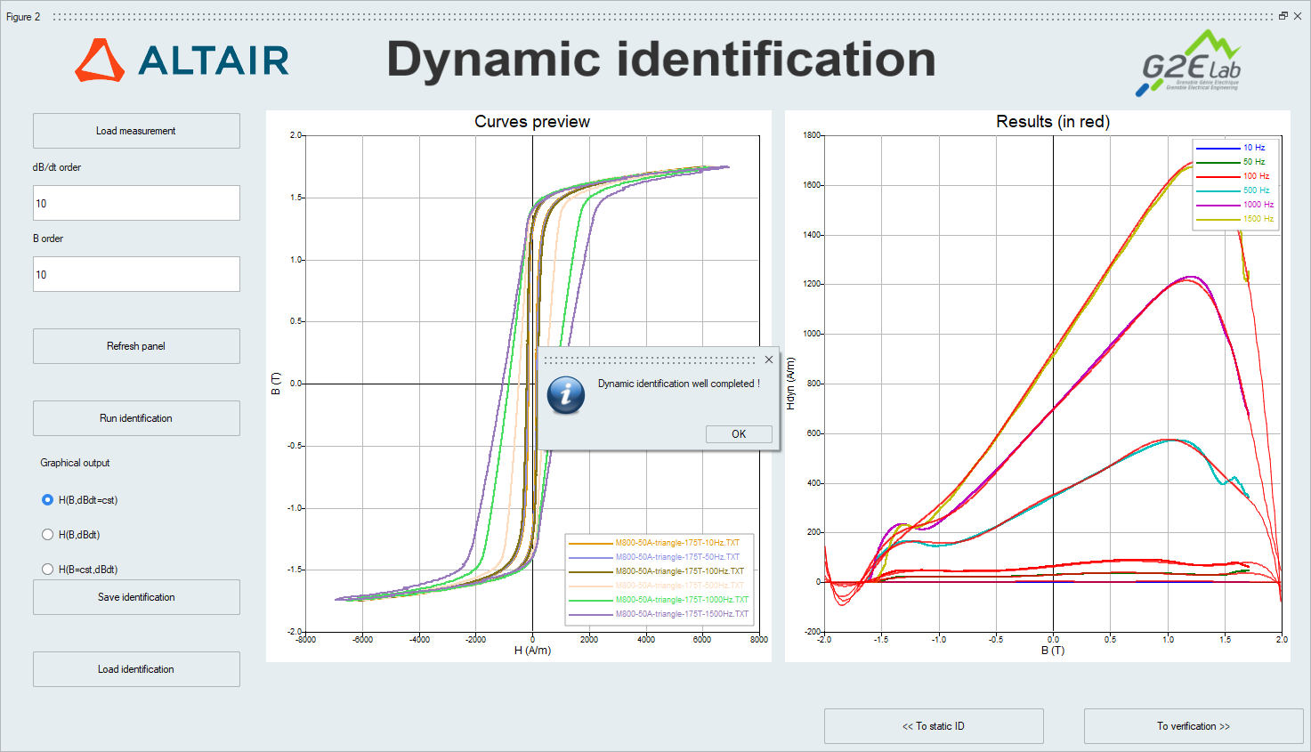Figure 3. Message annonçant la fin d'une identification.Note: Les résultats sont automatiquement affichés dans la fenêtre Results, comme montré dans la ci-dessus. Les courbes rouges correspondent aux résultats tandis que les courbes multicolores correspondent aux mesures.Note: L'utilisateur peut ajuster les ordres des polynômes des étapes 2.3 et 2.3 et en observant les courbes reconstruites dans la fenêtre Results. - Étape 2.5: Une fois l'identification terminée cliquez sur le bouton To verification (étiqueté 2.5 dans la Figure 1) afin de continuer vers Panneau 3 : Vérification générale.
