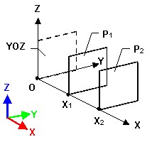 - le second plan (P2) est défini par une translation du plan P1 suivant OX (OY ou OZ respectivement) : déplacement suivant X (X2 -X1)