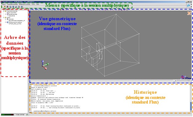 La fenêtre de la session multiphysique se constitue de plusieurs zones (identique au contexte standard Flux) :