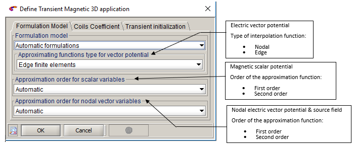 In manual mode, the user can modify the order (1st order / 2nd order) and the type of approximation functions (nodal type/edge type for the electric vector potential). These modifications are carried out in the dialog box of the application definition as presented in the figure below.