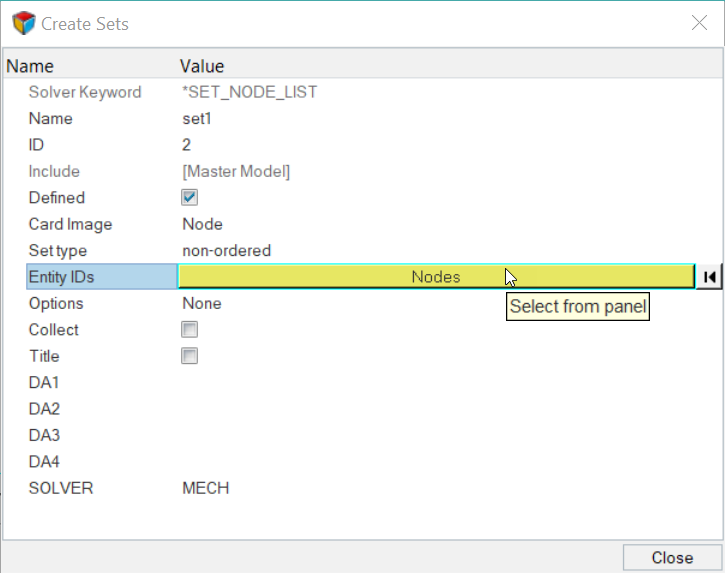 - While the Interfaces panel, add subpanel has several main and secondary entity types to choose from in order to specify the LS-DYNA main or secondary set for a *CONTACT, only the valid main and secondary types are selectable for the particular contact you are creating.
