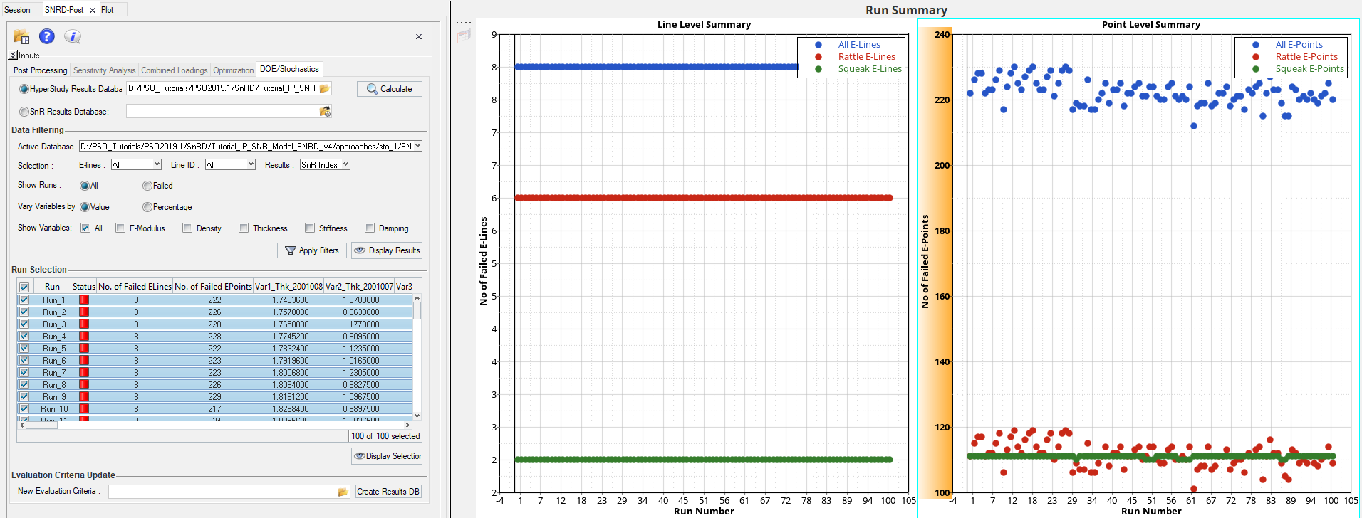 SnRD Post Stochastics and DoE module allows the analyst to investigate hundreds of simulation results in a powerful way. When multiple variational studies have been setup, and results imported, SnRD will automatically post process all the Rattle and Squeak results for high level and deep dive investigation. The analyst can have multiple goals out of this analysis. Some of them are detailed below: