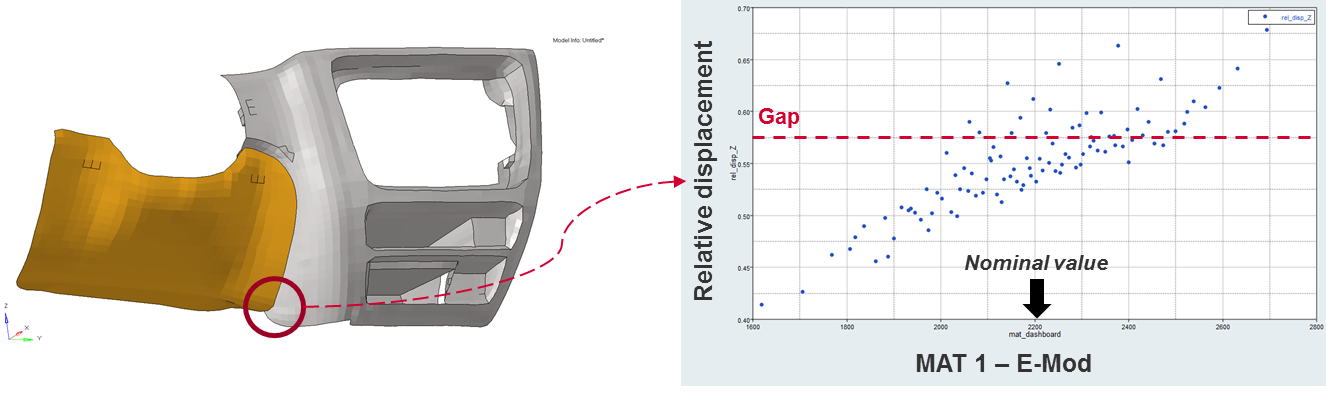 When using Design of Experiment, one can explore optimums around which the relative displacement responses are the lowest. Typically, engineering is trying to reduce weight and cost, so finding alternative combination where a softer material can be used while improving or keeping the performance is highly appreciated by the buyers