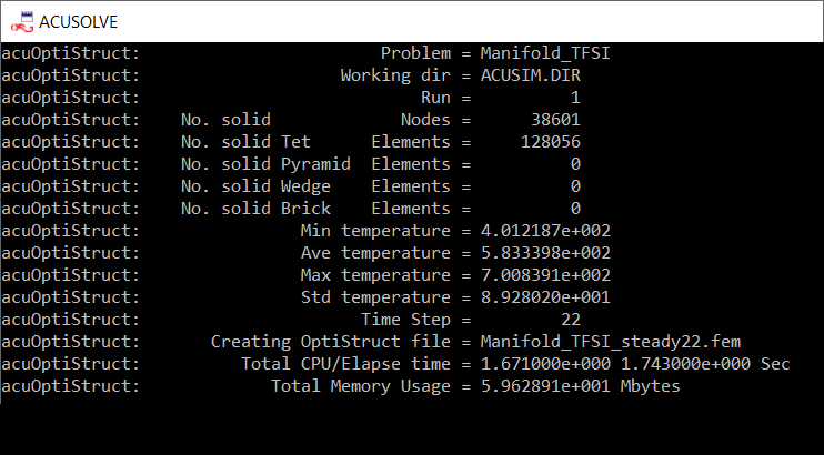 acuOptiStructは、AcuSolveの共役熱伝達CFDシミュレーションから得られる流れデータと熱データを使用して、温度荷重と圧力荷重を指定し、OptiStructを使用して熱応力解析を実行するために必要なファイルを生成します。acuOptiStructは、AcuSolveシミュレーションの完了後に実行され、AcuSolveの実行から得られるソリッド要素のメッシュデータ、およびソリッドメッシュの接液面上の対流熱伝達情報を書き出します。データはOptiStructフォーマットで直接記述され、メッシュから別のメッシュへの結果投影に起因するデータ損失が排除されるとともに、温度と熱伝達係数の空間的変動での忠実性が追加されます。