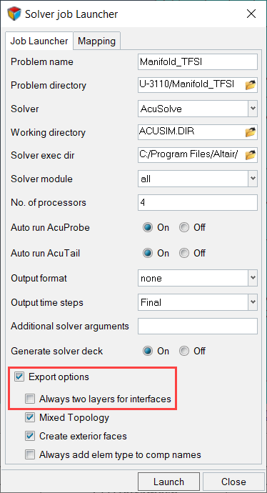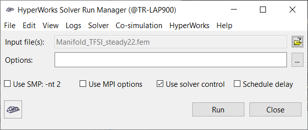 AcuSolveの解が計算されたので、‘acuOptiStruct’ユーティリティを使用してOptiStructの入力デックを生成し、HyperWorks Solver Run Managerを使用してケースを実行する準備ができています。シンプルなユーティリティであるHyperWorks Solver Run Managerでは、適切な入力ファイル(複数可)を選択して、表示される欄にオプション(必要な場合)を入力することで、任意のHWソルバーを起動できます。OptiStructは業界で実績のある最新の構造解析ソルバーであり、静的 / 動的荷重下の線形 / 非線形構造問題に対応しています。OptiStructは、スタートメニューから直接起動できます。