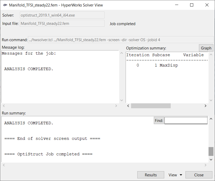 次の手順では、.femファイルを生成するための必要なオプションを指定してacuOptiStructコマンドを実行します。その後、OptiStructを使用して構造問題を解析します。
