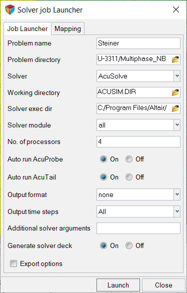 AcuSolveの実行が完了したら、HyperWorks Solver Viewダイアログを閉じます。HyperMesh Desktopウィンドウで、AcuSolve ControlダイアログとSolver job Launcherダイアログを閉じます。次のいくつかの手順では、蒸気の体積分率のコンターをプロットします。