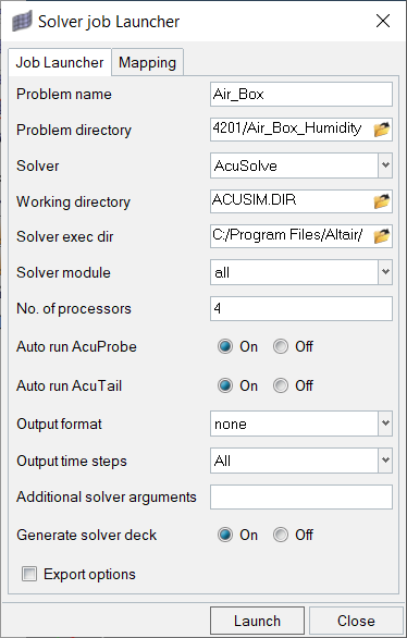 このチュートリアルでは、湿度モデルを使用して閉じられた空気ボックスの過渡シミュレーションを実行する手順を説明します。このチュートリアルを実行する前に、入門チュートリアルをすでに完了し ACU-T:1000 HyperWorksユーザーインターフェース、およびAcuSolveの基本を理解しているものとします。この解析を実行するには、ライセンス供与済みバージョンのHyperMeshとAcuSolveにアクセスできる必要があります。