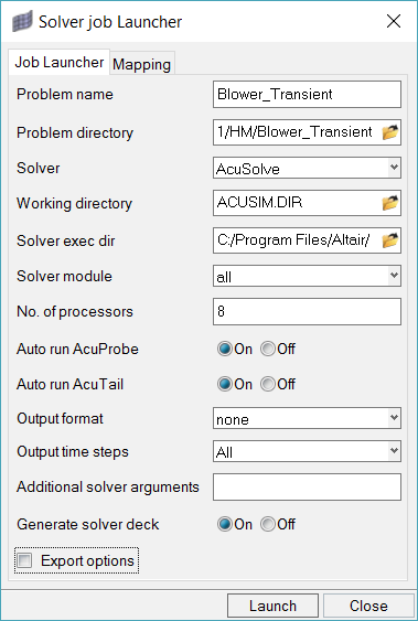 このチュートリアルを実行する前に、HyperMesh_tutorial_inputs.zipを<Altair_installation_directory>\hwcfdsolvers\acusolve\win64\model_files\tutorials\AcuSolveから作業ディレクトリにコピーします。 ACU-T5001_BlowerTransient.hm HyperMesh_tutorial_inputs.zipから