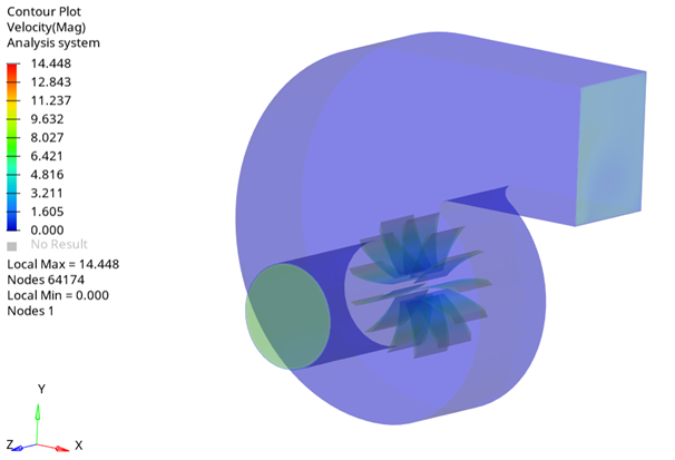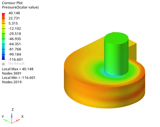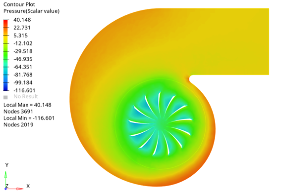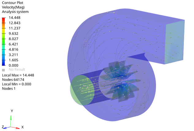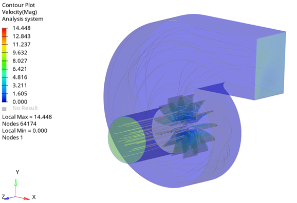 このチュートリアルでは、スライディングメッシュ手法を使用して、遠心送風機の過渡シミュレーションを設定して解析する方法を知ることができました。まず、メッシュが生成されたジオメトリをインポートし、定常状態シミュレーションを実行しました。次に、AcuProjツールを使用した過渡シミュレーションの開始点として定常状態結果を使用して節点初期状態を指定し、移動座標系手法の代わりにスライディングメッシュ手法を使用して過渡シミュレーションを解析しました。過渡解が計算された後、HyperViewを起動して、圧力コンターと流線のアニメーションを作成しました。