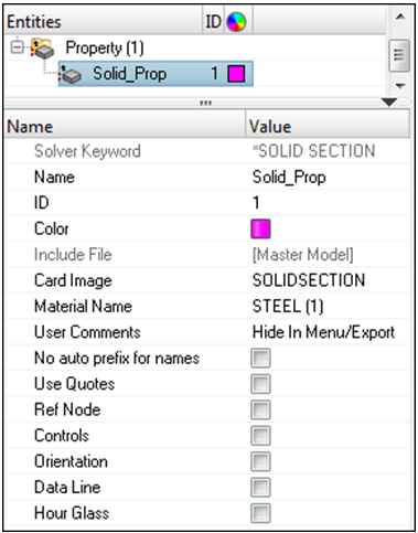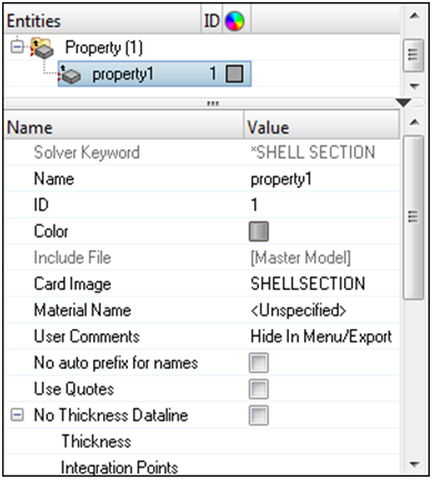 *SHELL SECTION, ELSET=HMprop_property1, MATERIAL=HMprop_ prefixは、プロパティのカードイメージにおいて、No_auto_prefix_for_names チェックボックスを選択することで、抑制されます。