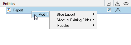 マスターPresentationドキュメント内で定義されているレイアウトに基づき、スライドをレポートに追加します。