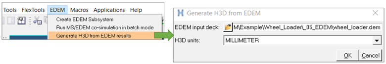 EDEM結果は、MotionViewのEDEMメニューにあるGenerate H3D from EDEM結果ツールを使用してH3Dフォーマットに変換することにより、HyperViewで表示できます。