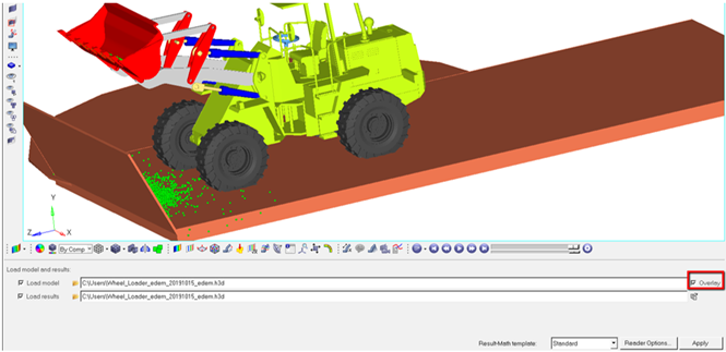 - システム全体を1つの環境で可視化するには、Load Model and ResultsパネルのOverlayオプションを使用して、HyperViewでEDEMのH3Dをオーバーレイ表示します。