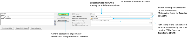 - MotionView Export directory – リモートサーバー上のEDEMに形状を転送する場合にのみ使用します。両方のマシンからアクセスできる共有ディレクトリを選択します。MotionViewでは、このディレクトリを一時的な場所として使用し、形状を転送します。